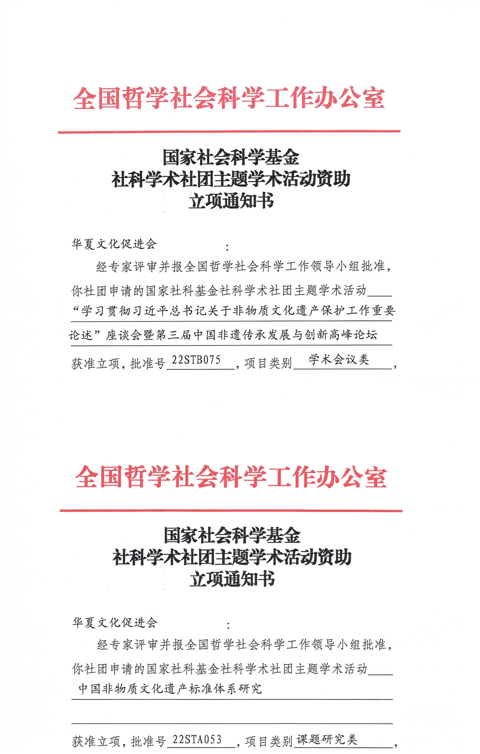 我会学术会议类获准立项一项,主题活动名称为:“学习贯彻习近平总书记关于非物质文化遗产保护工作重要论述”座谈会暨第三届中国非遗传承发展与创新高峰论坛。课题研究类获准立项一项,课题名称为:“中国非物质文化遗产标准体系研究”。